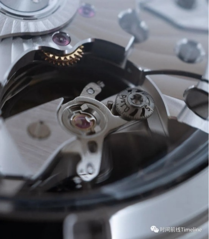 使用柱狀輪,垂直離合,硅游絲,無卡度砝碼微調(diào),擺頻28800次/時,動力60小時。但各位可以看到,擺輪夾板上,多了Spirate系統(tǒng)的調(diào)節(jié)“小圓片”。