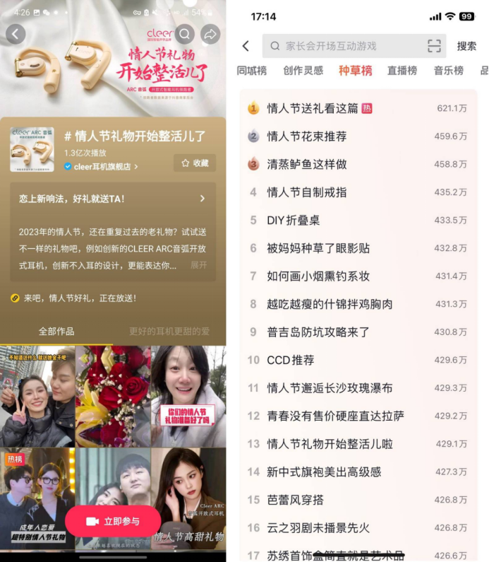 在情人節(jié)期間,Cleer耳機打造#情人節(jié)開始整活了#熱點話題營銷,帶動不同層級的達人共創(chuàng)內(nèi)容,形成高熱話題,鼓勵用戶一起來“接梗”“玩?!?#xff0c;在全民“追熱點”的過程中,全面引爆了品牌種草熱度。數(shù)據(jù)顯示,話題最終登陸種草榜13位,曝光達1.3億。