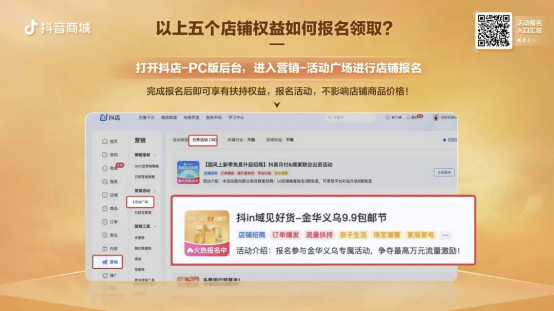 對(duì)于已入駐抖音電商且體驗(yàn)分>4.5的商家,平臺(tái)帶來了五大店鋪權(quán)益。商家打開抖店-PC版后臺(tái),進(jìn)入營銷-活動(dòng)廣場(chǎng),即可報(bào)名領(lǐng)取相關(guān)權(quán)益。