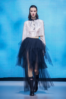 在“童年”主題秀演中,法國設(shè)計師聯(lián)袂浙江懿紗紡織科技有限公司、紹興柯橋豐旺紡織品有限公司,圍繞兒童的藝術(shù)、回到學(xué)校、童年的回憶三個子主題,共同演繹了童年的懷舊故事。設(shè)計師以精細(xì)的絎縫、印染、明線縫紉及自然著色的效果制作服裝和圖案,在工藝上采用了法國特有的編織技術(shù),并結(jié)合WALTZ系列花紗、三醋酸、錦滌歐根紗、六角硬網(wǎng)等面料輕薄有型、色彩飽滿的特色,最大程度實現(xiàn)了紡織工藝的價值化。特別是在傳統(tǒng)手工藝非遺、生態(tài)環(huán)保材料等系列元素的加持下,為整場秀演增添了可持續(xù)時尚的價值。