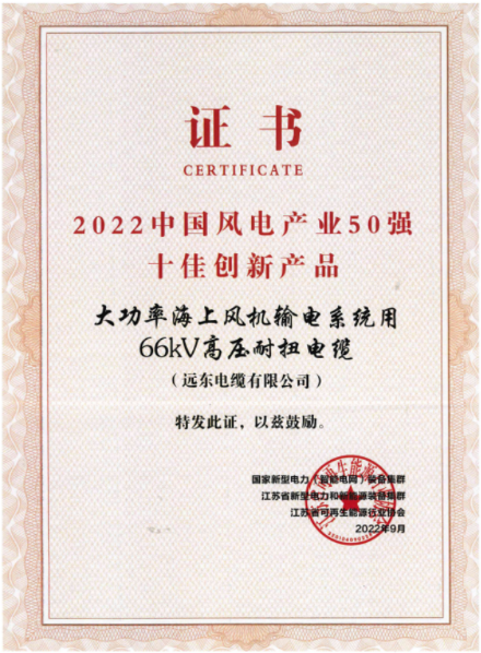 該系列產(chǎn)品主要應(yīng)用于海上大功率風(fēng)電機組電力傳輸,不僅可以有效地提升傳輸容量和效率,降低系統(tǒng)損耗,還可以實現(xiàn)全壽命周期內(nèi)安全可靠運行,是大功率海上風(fēng)電機組亟需的核心部件,也是未來海上大功率風(fēng)力發(fā)電技術(shù)發(fā)展趨勢。并成功應(yīng)用于華電臺州玉環(huán)、福清興化灣等多個海上風(fēng)電場等項目,還被授予了國家工信部頒發(fā)的“制造業(yè)單項冠軍”、2022中國風(fēng)電產(chǎn)業(yè)50強“十佳創(chuàng)新產(chǎn)品”等多項榮譽,獲得了從國家到行業(yè)的高度認可,夯實了公司在風(fēng)電電纜行業(yè)的領(lǐng)軍地位。
