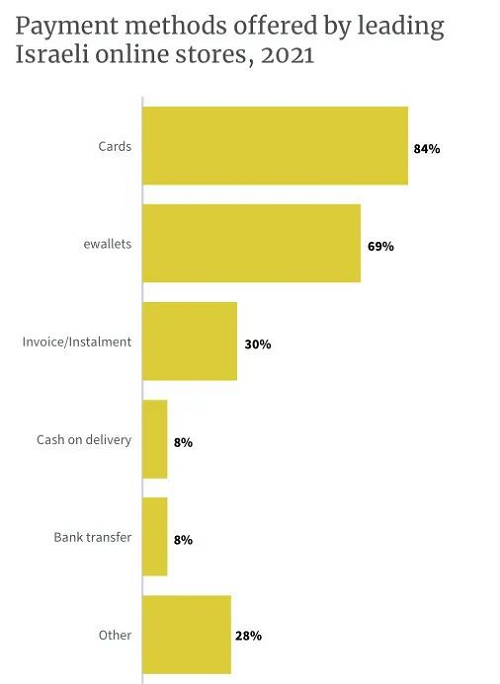 以色列主要的支付方式包括Visa、MasterCard,Isracard(以色列本土支付方式),Paypal、Other Wallets和American Express??ㄖЦ对谝陨蟹浅A餍?#xff0c;TOP100的零售商中,84%提供信用卡支付,69%提供電子錢包支付,Visa和萬事達信用卡是當?shù)刈钍軞g迎的付款方式。