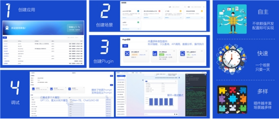 通過(guò)智能編排,OctopusX能夠?qū)⒛P头?wù)、業(yè)務(wù)功能、數(shù)據(jù)資源等緊密融合,以滿(mǎn)足不同領(lǐng)域、不同場(chǎng)景的需求。無(wú)需強(qiáng)開(kāi)發(fā),用戶(hù)通過(guò)配置即可快速實(shí)現(xiàn)一個(gè)基于大模型的AI場(chǎng)景,僅需4步便能快速響應(yīng)。在業(yè)務(wù)場(chǎng)景數(shù)據(jù)條件具備的情況下,一個(gè)場(chǎng)景僅1天即可上線。