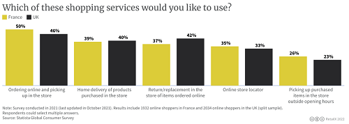 法國電商市場(chǎng)成熟,形態(tài)發(fā)展多樣,電商平臺(tái)和本地零售企業(yè)打得火熱,后者提供的“線上下單,線下自提”服務(wù)贏得了許多法國消費(fèi)者的青睞。