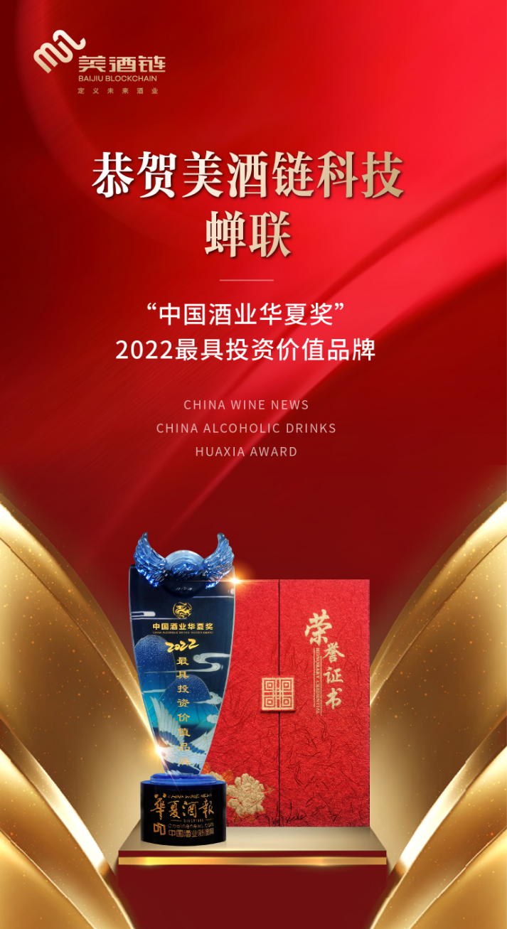 2023年“中國酒業(yè)華夏獎”頒獎典禮于4月10日下午在成都祥宇賓館舉行,美酒鏈科技因具有突出的科技創(chuàng)新表現、賦予高端白酒收藏和價值賦能的行業(yè)影響力,再次蟬聯(lián)“中國酒業(yè)華夏獎:2022最具投資價值品牌”獎項,這是中國酒業(yè)權威機構和消費大眾對美酒鏈科技創(chuàng)新精神的高度認可。