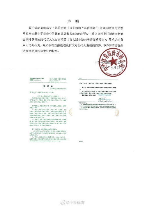 賽后,中喬體育發(fā)出官方聲明,要求運動員糾正違約行為并寄出律師函。據(jù)悉,Kelvin Kiptum (凱爾文·基普圖姆)于今年3月8日正式成為中喬體育品牌代言人,中喬體育通過官方渠道釋放了這一訊息。在賽前一系列訓(xùn)練,Kelvin Kiptum (凱爾文·基普圖姆)也使用中喬體育的運動產(chǎn)品,但在倫敦馬拉松正式比賽上卻公然違約,這一行為在網(wǎng)絡(luò)上引發(fā)熱議。在社交媒體上,眾多體育愛好者表示憤慨,并支持中喬體育合理維權(quán),事件的后續(xù)發(fā)展受到體育圈層的廣泛關(guān)注。