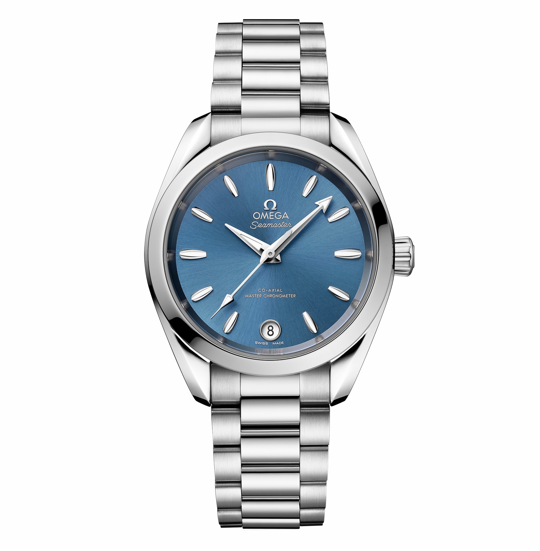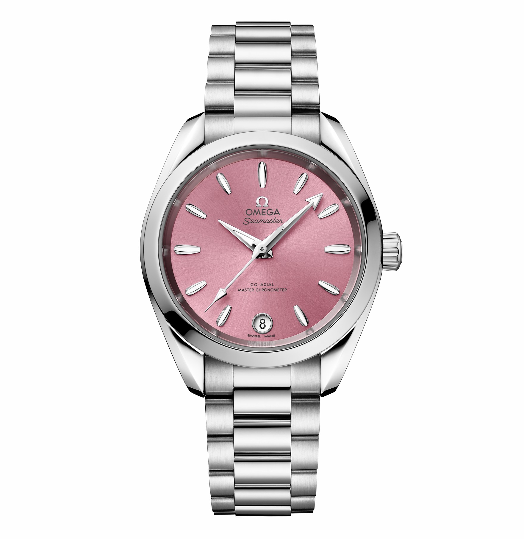 對于女性而言,Aqua Terra 150米34毫米至臻天文臺表或許會更加得心應(yīng)手一點吧。其整體內(nèi)外的設(shè)計基本延續(xù)了36毫米款的特征,變化主要在于盤面的色彩,如貝殼粉色凸顯出其時尚的柔美,而海藍色表盤則有剛?cè)岵奈兜?#xff0c;兩者都帶有明顯的婉約色彩,可能頗投女性的眼緣吧。此外,其指針、小時刻度和歐米茄品牌標識均以拋光白色18K金制成,6點位的日歷窗由硬朗的梯形變成可愛的圓形,無疑強化了其女表的色彩。